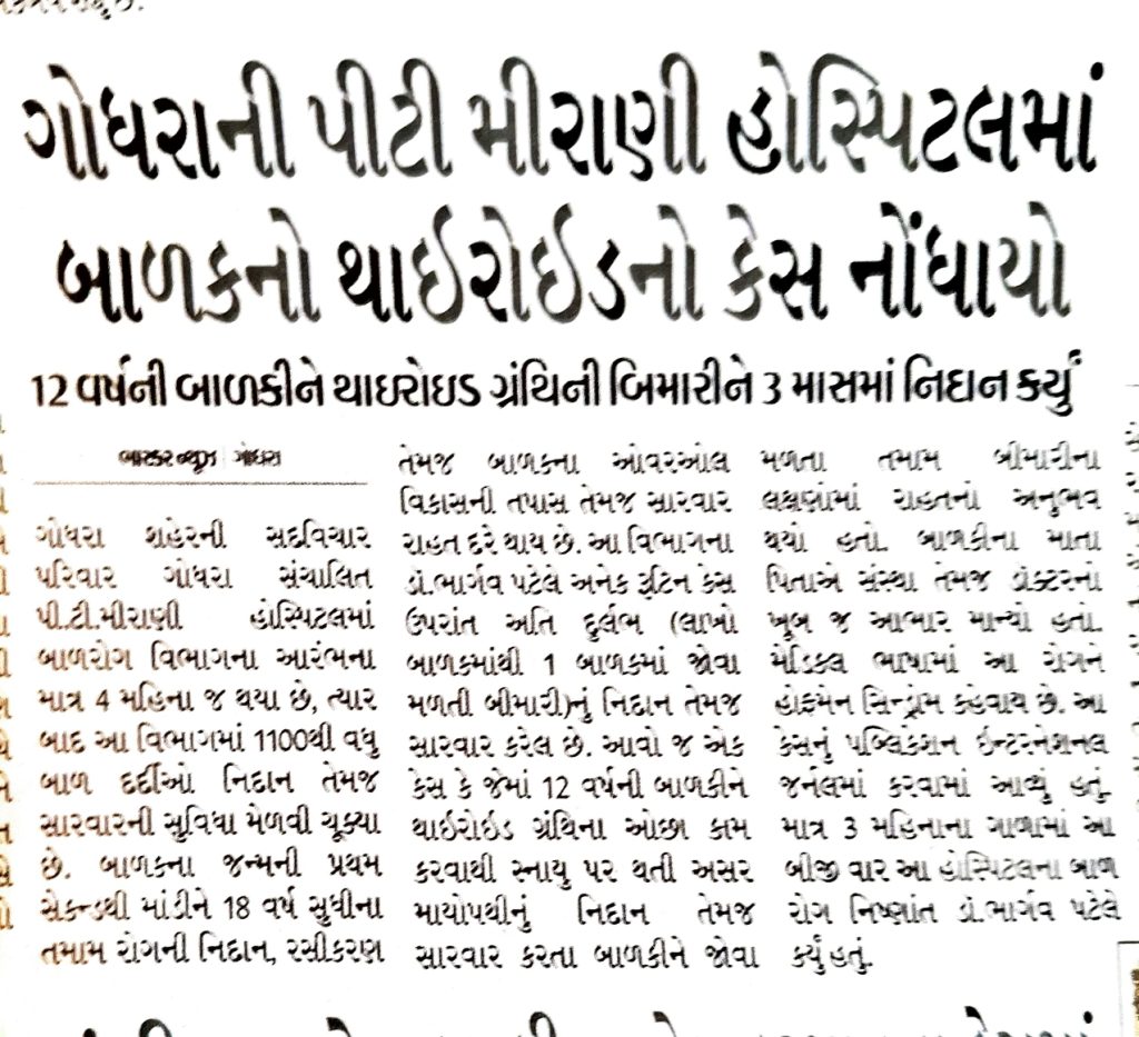 ગોધરા સદવિચાર પરિવાર ના ડોક્ટર શ્રી ભાર્ગવ પટેલ દ્વારા દુર્લભ હોર્મોન નો વિકાર પ્રકારનો ભારતનો પ્રથમ બાળકોનો કેસ નિદાન કરી